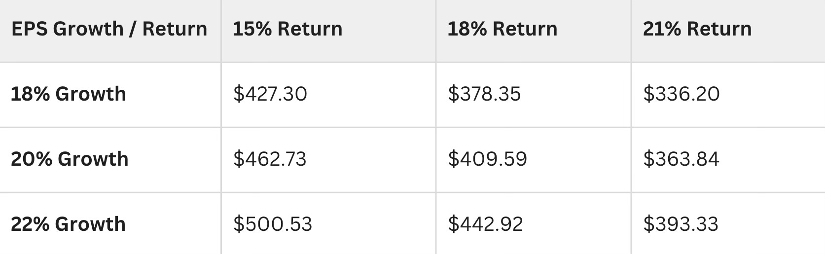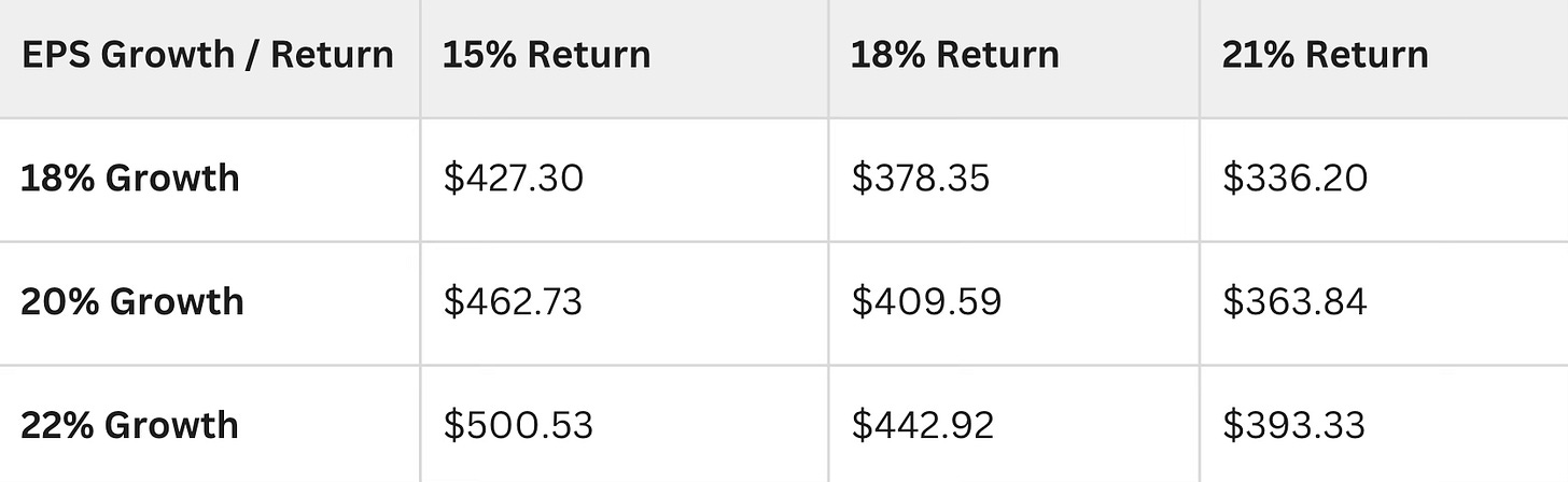 In the base-case scenario, where EPS grows at 18% per year for the next five years, the stock is still trading below its intrinsic value of $336.20, yielding a 21% annual return.