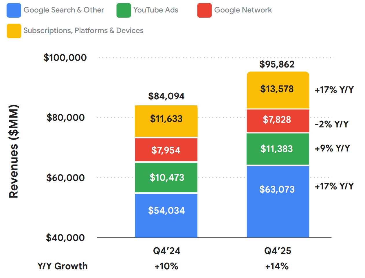 Search & Other, and Subscriptions, Platforms & Devices revenues are up 17% YoY in Q4, YouTube Ad revenues are up 9%, and Google Cloud revenues are up a staggering 48% as well.