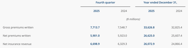 Other than that, to Fairfax’s credit, the company managed its other insurance operating expenses really well, which were essentially flat year over year, and the combined ratio was 93% for the full year, a modest 30 basis point increase from 92.7% in 2024.